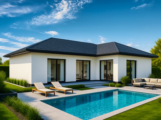 Der Bungalow 139 bietet mit knapp 140 m² Wohnfläche eine ideale Lösung für Familien, die großzügig, aber dennoch praktisch wohnen möchten. Mittelpunkt des Hauses ist der weitläufige Wohn-, Ess- und Kochbereich mit über 53 m², der als offenes Herzstück das Familienleben zusammenführt. Hier entsteht Raum für gemeinsame Mahlzeiten, gesellige Runden und entspannte Abende. Das Elternschlafzimmer überzeugt mit rund 19 m² und einer angrenzenden Ankleide, die für Ordnung und Komfort sorgt. Drei weitere Zimmer mit Flächen zwischen 12 und 14 m² stehen flexibel zur Verfügung – ideal als Kinderzimmer, Gästezimmer oder Arbeitsbereich. Ergänzt wird der Grundriss durch ein modernes Bad, einen praktischen Hauswirtschaftsraum und kurze Wege durch Diele und Flur, die die Räume klar miteinander verbinden. Mit seiner durchdachten Aufteilung schafft der Bungalow 139 ein Zuhause, das den Bedürfnissen einer Familie gerecht wird und zugleich vielfältige Gestaltungsmöglichkeiten bietet.