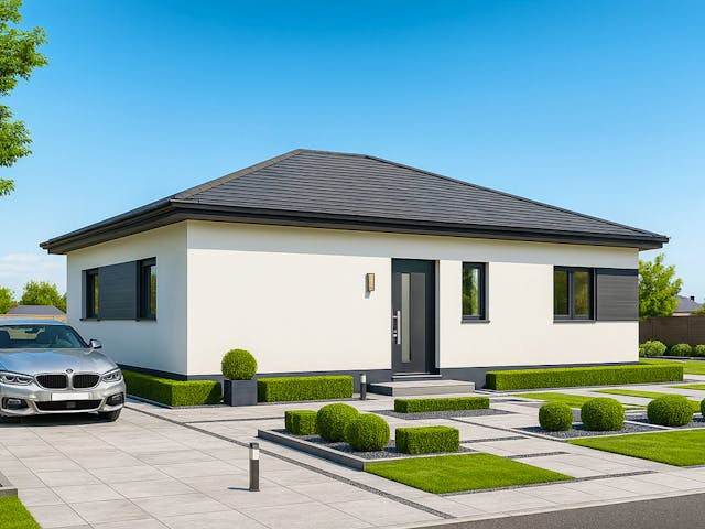 Bungalow 88 – Kompakt und durchdacht auf einer Ebene Der Bungalow 88 überzeugt mit einer klaren und funktionalen Raumaufteilung, die auf einer Ebene alle wichtigen Wohnbereiche vereint. Im Mittelpunkt steht der großzügige Wohn- und Essbereich mit knapp 37 m², der dank der bodentiefen Fenster lichtdurchflutet ist und direkten Zugang zur Terrasse bietet. Die Küche ist mit rund 14 m² separat abgetrennt und bietet damit ausreichend Platz für Familien, die Wert auf einen eigenen Kochbereich legen. Das Elternschlafzimmer mit 12 m² sowie das helle Kinderzimmer mit 11,5 m² schaffen private Rückzugsorte, während das zentral gelegene Bad mit Wanne und Doppelwaschbecken Komfort für den Alltag bietet. Praktisch ergänzt wird der Grundriss durch einen Hauswirtschaftsraum und eine kompakte Diele, die den Eingangsbereich strukturiert. Mit seiner kompakten Größe eignet sich der Bungalow 88 ideal für kleine Familien, Paare oder Bauherren, die Wohnen auf einer Ebene schätzen und dabei nicht auf durchdachte Raumlösungen verzichten möchten.