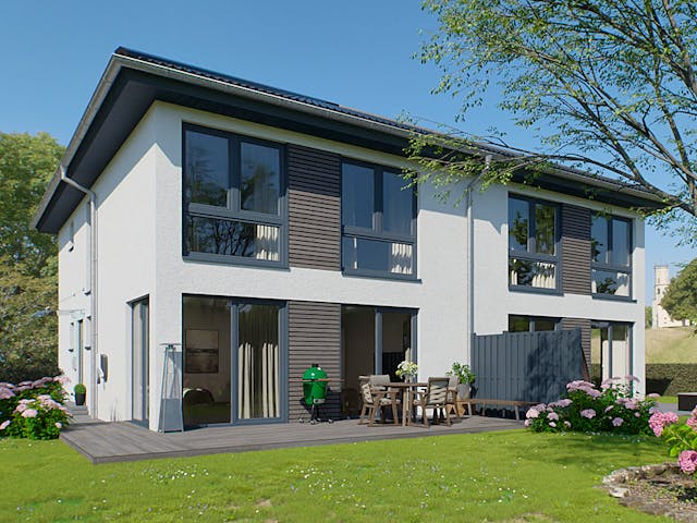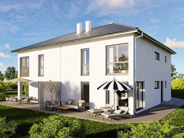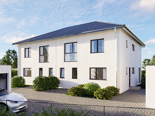 Ein Doppelhaus, dass durch seinen Stil wie eine Stadtvilla wirkt. Viele Fenster und die gerade Treppe machen das Haus modern und weitläufig. Da wir individuell bauen, bekommen Sie unserer Preis nach Ihrer ersten Planung. Im Preis inbegriffen Dieses Haus ist ausgestattet mit einer Fußbodenheizung, Luft-Wasser-Wärmepumpe und Rolläden. Außerdem wählen Sie die Fenster- und Haustürfarbe, sowie die sanitäre Standardeinrichtung verschiedener Markenfirmen. Unser Preis versteht sich inklusive Bodenplatte und Erdarbeiten. All unsere Typenhäuser sollen Ihnen eine erste Idee geben. Grundsätzlich setzen wir alle Veränderungen um, wenn es bauseits möglich ist. Wenn das Haus doch ein bisschen größer werden soll, oder die Haustüre an einer anderen Stelle sein könnte, oder die Fenster bodentief besser wären....dann melden Sie sich bei uns - wir machen das schon.