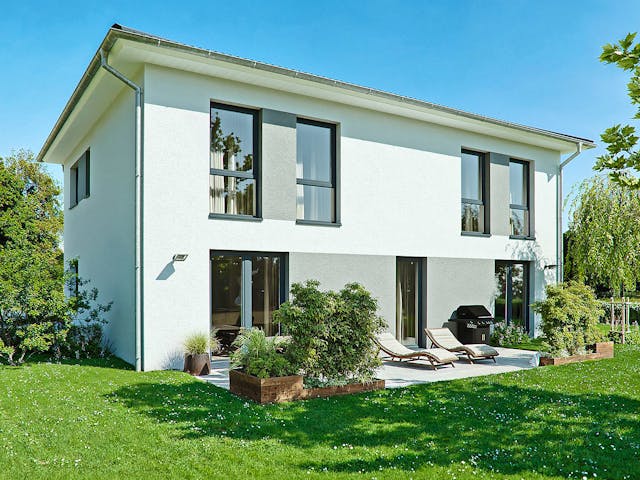 Unser kleines Mehrfamilienhaus, das drei Familien Platz bietet. Zum einen die Erdgeschosswohnung, zum anderen teilen sich das Obergeschoss zwei Wohnungen. Da die Wohnungeinheiten unabhängig voneinander sind, haben Sie als Bauherr des Hauses drei Mal Anspruch auf staatliche Förderungen, wenn wir auf Ihren Wunsch EH40 bauen. Dieses Haus ist ausgestattet mit einer Fußbodenheizung, Luft-Wasser-Wärmepumpe und Rolläden. Außerdem wählen Sie die Fenster- und Haustürfarbe, sowie die sanitäre Standardeinrichtung verschiedener Markenfirmen. Unser Preis versteht sich inklusive Bodenplatte und Erdarbeiten. All unsere Typenhäuser sollen Ihnen eine erste Idee geben. Grundsätzlich setzen wir alle Veränderungen um, wenn es bauseits möglich ist. Wenn das Haus doch ein bisschen größer werden soll, oder die Haustüre an einer anderen Stelle sein könnte, oder die Fenster bodentief besser wären....dann melden Sie sich bei uns - wir machen das schon. Da wir individuell bauen, bekommen Sie unseren Preis nach Ihrer ersten Planung.