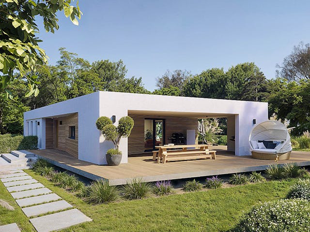 Bungalow 113.1 - Architektonischer Lifestyle auf einer Ebene. Dieser Bungalow verfügt über eine hochmoderne Architektur bei effizienter Ausnutzung der Grundfläche. Durch die großzügig gestalteten Fensterflächen wirken alle Bereiche hell und freundlich. Im Sommer bieten die groß dimensionierten Dachüberstände angenehmen Schatten. Der Wohn-Essbereich mit der offenen Küche sind der Kommunikationsmittelpunkt im Haus. Beim Bungalow 113.1 handelt es sich um ein Typenhaus. Das Haus wird in massiver Bauweise Stein auf Stein errichtet. Zum Einsatz kommen nur Produkte namhafter Hersteller. Alle unsere Haustypen sind auf Wunsch auch als KfW-40-Effizienzhäuser mit QNG-Zertifizierung erhältlich - für zukunftssicheres Bauen mit attraktiver staatlicher Förderung. Individuelles Bauen gehört zu unserem Markenkern. Deshalb planen wir Ihr Wunschhaus auch ganz individuell nach Ihren Vorgaben. Unsere Architekten setzen Ihre Vorgaben dabei in kreativer Weise um und geben Ihnen wertvolle Tipps.
