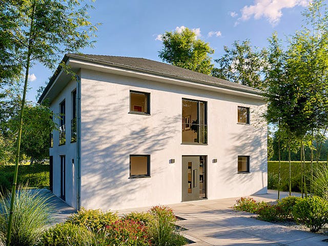 Stadtvilla 154.1 - 2 Vollgeschosse mit viel Platz für die ganze Familie Die Stadtvilla 154.1 besticht durch seine effiziente Grundrissplanung und maximale Flächenausnutzung. Bodentiefe Fenster und Fenstertüren sorgen für ein helles, freundliches Wohngefühl. Durch die offene Küche zum Wohn-Essbereich wird Transparenz geschaffen. Eine separate Ankleide und 2 Dusch-WC´s steigern den Wohnkomfort. Bei der Stadtvilla 154.1 handelt es sich um ein Typenhaus. Das Haus wird in massiver Bauweise Stein auf Stein errichtet. Zum Einsatz kommen nur Produkte namhafter Markenhersteller. Alle unsere Haustypen sind auf Wunsch auch als KfW-40-Effizienzhäuser mit QNG-Zertifizierung erhältlich - für zukunftssicheres Bauen mit attraktiver staatlicher Förderung. Individuelles Bauen gehört zu unserem Markenkern. Deshalb planen wir Ihr Wunschhaus auch ganz individuell nach Ihren Vorgaben. Unsere Architekten setzen Ihre Vorgaben dabei in kreativer Weise um und geben Ihnen wertvolle Tipps.