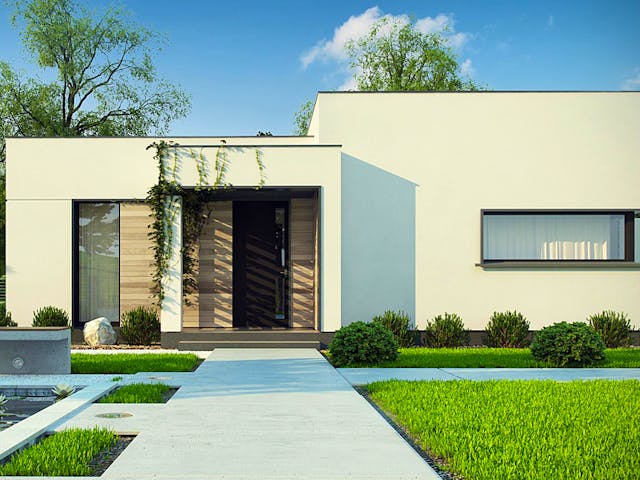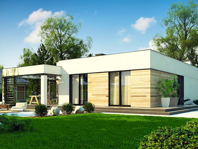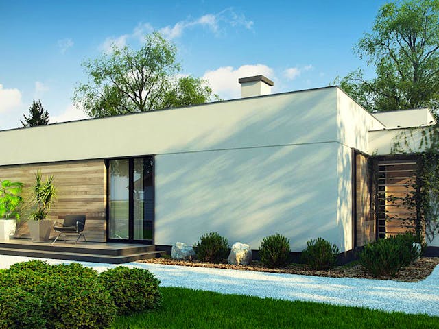 ZX138HB – DER MODERNE BUNGALOW Dieses Einfamilienhaus begeistert besonders Menschen, die modernen Stil mögen und ein Holzhaus bauen möchten. Der Bungalow überzeugt trotz der begrenzten Abmessungen des Hauses, da hier auch bei einer vierköpfigen Familie jeder sein eigenes Reich genießen kann. Auf der Wohnfläche verteilen sich Wohnzimmer und Esszimmer mit Durchgang zur Küche. Zusätzlich befindet sich hier ein praktischer Hauswirtschaftsraum, ein Badezimmer und eine Gästetoilette. Es gibt drei Schlafzimmer, von denen eines am größten ist, während die beiden anderen nahezu gleich groß sind und sich beispielsweise als Kinderzimmer, Arbeitszimmer, Gästezimmer und Hobbyraum eignen. Ihren Gestaltungsmöglichkeiten sind keine Grenzen gesetzt, so dass dieser Bungalow in jeder Hinsicht Ihr perfektes Zuhause sein kann.