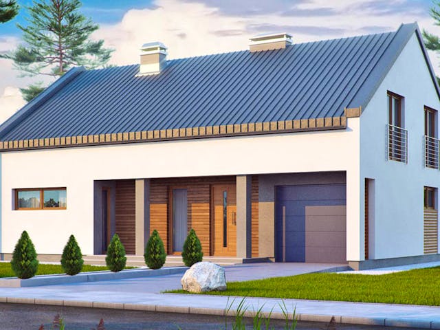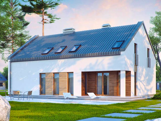 ZX43 - GROSSZÜGIG MIT SATTELDACH UND Garage Das moderne und geräumige Satteldachhaus mit Garage bietet jede Menge Platz für die unterschiedlichsten Ideen und individuellen Umsetzungen. Im Erdgeschoss befindet sich das ausgesprochen großzügige Wohnzimmer mit weiten, panoramischen Fenstern, die auf Wunsch auch bodentief installiert werden. Um die in der Mitte des Hauses gebaute Treppe liegen das Esszimmer mit fließendem Übergang zur Küche mit Speisekammer. Von jedem dieser Räume aus hat man Zugang zu einer teilweise überdachten Terrasse und zum umliegenden Garten. Im Flurbereich liegt der Zugang zu einer Gästetoilette und einem Hauswirtschaftsraum. Dieser bietet auch einen praktischen zweiten Zugang zu der 25,5 m² großen Garage, so dass Sie beispielsweise vor Regen geschützt ins Haus gelangen können. In der oberen Etage finden sich vier Räume, zwei Ankleidezimmer und zwei Badezimmer. Dieses geräumige Haus bietet Ihnen viel Platz zum Wohlfühlen.