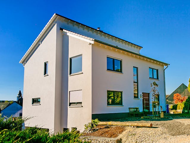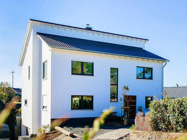 Wellness im eigenen Haus – ein großartiges Erlebnis! Mit 185 qm Wohnfläche, aufgeteilt auf lediglich 4 Zimmer, kann dieses freigeplante Einfamilienhaus mit versetztem Pultdach überzeugen. Das attraktive Gebäude mit der klar und modern gestalteten, schneeweißen Fassade ist zweigeschossig erbaut, komplett unterkellert und besonders hochwertig eingerichtet. Eines wird schon bei der Außenbetrachtung klar: Großflächige Glaselemente leiten jede Menge wohngesundes Tageslicht in die Innenräume. Gemeinsam mit den großzüßig angelegten Zimmern – inklusive Luftraum der Galerie – entsteht ein fantastisches Raumgefühl. Hochfunktional ist die Garage im Kellergeschoß angeordnet. Mit direktem Anschluss an den Flur erreichen die Hausbesitzer von hier aus selbst bei starken Regengüssen trockenen Fußes die Wohnräume. Definitiv DAS Highlight im Erdgeschoss ist das mit fast 52 qm riesige Wohnzimmer, welches durch die offene Küche mit Kochinsel zusätzlich aufgewertet wird. Das obere Geschoss zeigt dann, wie gut Wellness im eigenen Haus funktionieren kann. Es gibt hier u.a. einen Saunaraum mit Dusche und ein weiteres 19 qm großes Badezimmer. Schön geräumig ist auch Ankleidezimmer des Schlafzimmers, sodass hier einige Schrankwände untergebracht werden können.