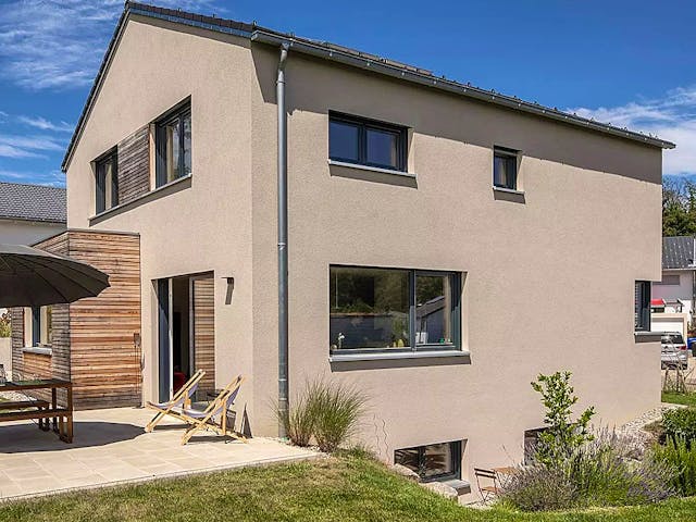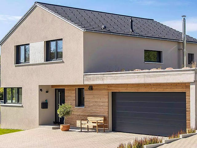 Das perfekte Einfamilienhaus mit Keller. Mit der in einem hellen Erdton gehaltenen Fassade mit partieller Holzverkleidung, anthrazitfarbenen Fenstern und Türen, dem reduzierten Dachüberstand und der aus dem Haus herausgezogenen Garage, ist Haus Junghans die moderne Interpretation eines klassischen Satteldachhauses. Rund 137 m² Wohnfläche bieten ausreichend Platz für eine vierköpfige Familie. Zu Haus Junghans gehören drei Schlafzimmer und zwei Bäder. Drei Kellerräume und ein Technikraum runden das Einfamilienhaus ab. Im Erdgeschoss geht es von der Diele aus rechter Hand direkt in ein Duschbad mit WC. Verschmutzte Kleidung rutscht durch einen Wäscheschacht direkt hinunter zur Waschmaschine. Im weiträumigen offenen Wohnbereich mit Wohnzimmer, Esstisch und Küche sorgen großflächige Fenster für viel Lichteinfall, der bei schönem Wetter auch auf der angeschlossenen Terrasse genossen werden kann. Eine edle Holztreppe führt hinauf ins Obergeschoss mit jeweils über 14 m² großen Kinderzimmern, dem Elternschlafzimmer mit abtrennbarem Ankleidebereich sowie dem Familienbad mit zwei Waschbecken, begehbarer Dusche, einer Badewanne und ebenfalls einem Wäscheschacht in den Keller. Preis auf Anfrage