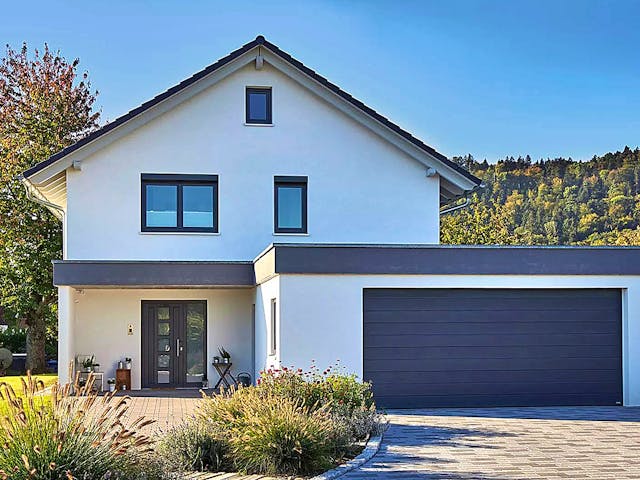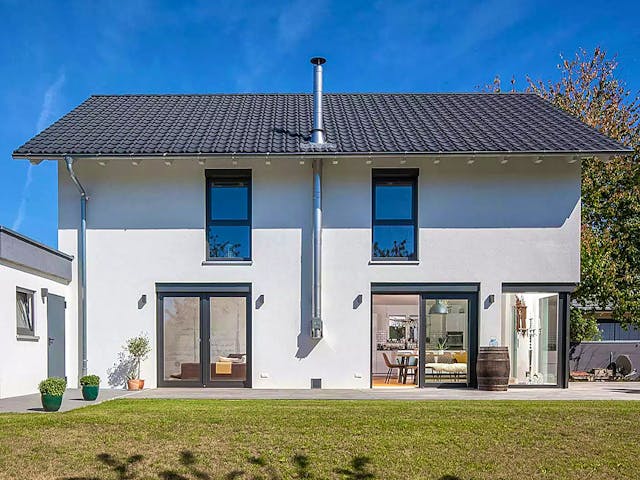 Moderner Einfamilienhausklassiker mit Keller. Als klassisches, zeitgemäß interpretiertes Einfamilienhaus präsentiert sich Haus Zimdal. Mit rund 160 m² Wohnfläche auf zwei Geschossen und einem Keller von 84 m² Grundfläche bietet es viel Raum zum Leben. Die weiße Putzfassade des Hauses wurde ergänzt um ein in Anthrazit eingedecktes Satteldach sowie anthrazitfarben Fenster- und Türelemente. Unter Haus Zimdal befindet sich ein praktischer Keller mit drei großen Kellerräumen, einem Technikraum sowie einem Duschbad. Das Erdgeschoss mit ca. 81 m² Wohnfläche wurde offen gehalten. Über die Diele sind ein Gäste-WC sowie die Küche mit Vorratsraum und der lichtverwöhnte Wohn-/Essbereich zu erreichen. Ein außergewöhnlich gut wirkendes Stilelement ist die Wand zum Flur aus Sichtbeton mit industriellem Charme, welche in Kombination mit dem warmen Parkettboden niemals kühl wirkt. Eine geradläufige Sichtbetontreppe mit glattschwarzem Stahlgeländer führt in das Dachgeschoss. Dieses umfasst 79 m² Wohnfläche und wurde mit zwei Kinderzimmern, einem Schlafzimmer mit Ankleidebereich sowie mit einem Bad mit Dusche und Badewanne geplant. Preis auf Anfrage