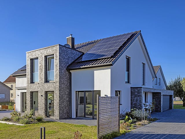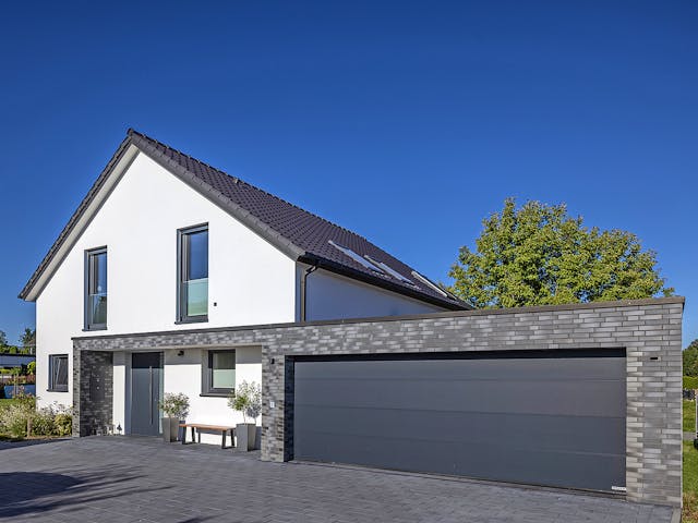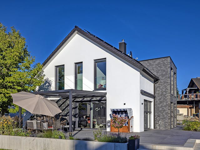Haus Ginsterweg bietet auf seinen rund 182 m² Wohnfläche Design, Komfort und Lebensqualität. Von außen erstrahlt es in hellem Putz, stilvoll akzentuiert durch dunklen Klinker. Innen bietet das Haus viel Platz für die Familie: Ein großzügiger Eingangsbereich, Duschbad, großer und offener Wohn-/ Ess und Kochbereich sowie ein weiterer Raum im Erdgeschoss, Schlafzimmer mit angrenzender Ankleide, großes Bad mit Sauna und zwei einladende Kinderzimmer im Obergeschoss. Als Effizienzhaus 40 Plus überzeugt es mit hochwertigen Dämmmaterialien, moderner Haustechnik und durchdachter Energiegewinnung auch in puncto Nachhaltigkeit. Preis auf Anfrage