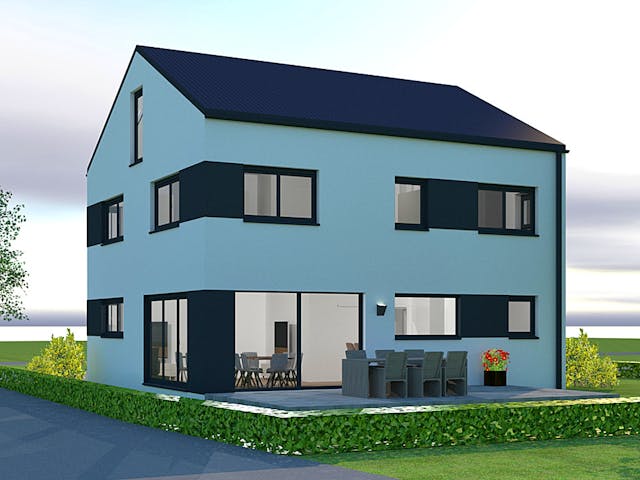 Als klassisch-modernes Einfamilienhaus, bietet dieses Haus eine perfekte Mischung aus Komfort und modernem Wohnen. Zwei Vollgeschosse bieten viel Platz, die helle Putzfassade mit dunklen Akzenten und klaren Linien strahlt Modernität aus, hohe Fenster verbinden den Wohnbereich mit dem Außenbereich.