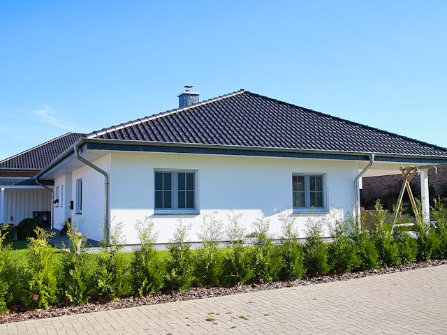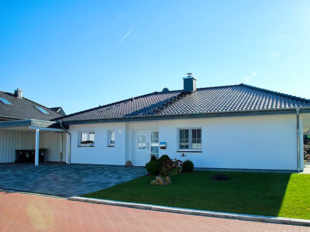 Dieser barrierefreie Bungalow vereint modernen Komfort auf einer Ebene. Der nahtlose Übergang vom Carport mit praktischem Abstellraum führt direkt in den Hauswirtschaftsraum und dann ins Herz des Hauses. Bodentiefe Fenster, ein gemütlicher Kamin und die Fußbodenheizung schaffen eine warme, behagliche Atmosphäre – ein Zuhause, das zum Wohlfühlen und Entspannen einlädt.