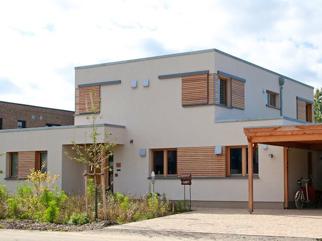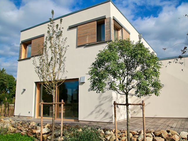 Dieses moderne Thoma Holz100 Massivholzhaus im Bauhausstil vereint klare Architektur mit nachhaltigem Wohnkomfort. Die Kombination aus Lärchenholz, Kalkputz und begrünter Dachlandschaft fördert ein gesundes Mikroklima. Innen schaffen Holzdielen, Holz- und Lehmwände sowie eine Infrarotheizung eine einzigartige Wohnatmosphäre, während der Kaminofen gemütliche Akzente setzt.
